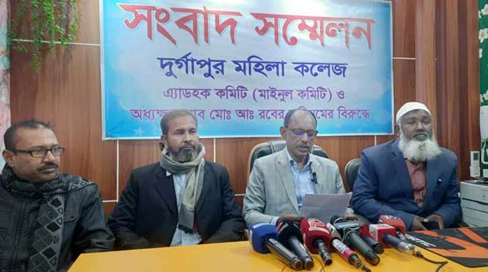 রাজশাহীর দুর্গাপুর মহিলা কলেজের আওয়ামী লীগপ্ন্থী অধ্যক্ষ আব্দুর রবের নানান অনিয়ম- দুর্নীতির বিচার চেয়ে সংবাদ সম্মেলন করেছেন একই কলেজের ভুক্তভোগী শিক্ষকরা।