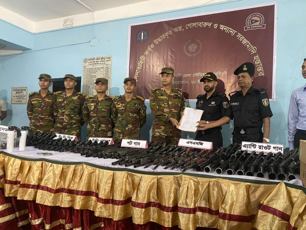 সোমবার সকালে সেসব অস্ত্র, গুলি ও ম্যাগাজিন নরসিংদীর ক্যাম্পের দায়িত্বে নিয়োজিত ২৮ ইস্ট বেঙ্গল রেজিমেন্টের অধিনায়ক লে. কর্নেল মোহাম্মদ ফাহিম মাহবুব র্যাব-১০ এর এএসপি এম জে সোহেলের কাছে কাছে হস্তান্তর করেন।