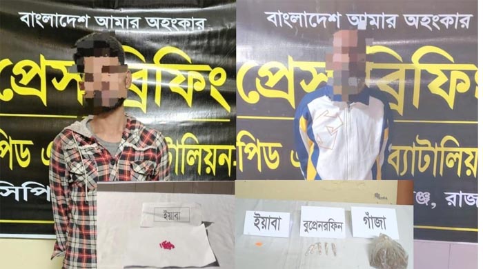 র্যাব জানায়, সোমবার (২২ ডিসেম্বর) বিকেলে সদর থানার বরেন্দ্রমোড় ইসলামপুর এলাকা থেকে মো. মেহের আলী (৩৫) কে ৫ পিস বুপ্রেনরফিন ইনজেকশন, ১০ পিস ইয়াবা ও ৪৫ গ্রাম গাঁজাসহ আটক করা হয়। একইদিন রাতে গোমস্তাপুর থানার রহনপুর পৌরসভার নুনগোলা এলাকায় মনিরুল ইসলাম (৫৫) কে ৪০ পিস ইয়াবাসহ গ্রেপ্তার করা হয়।