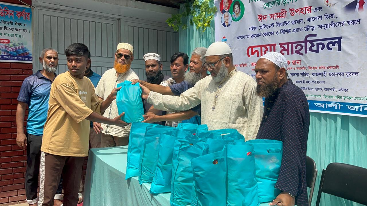 রাজশাহীতে ফিরোজ কবির ফুটবল একাডেমীর উদ্যোগে খেলোয়াড়দের মাঝে ঈদ সামগ্রী বিতরণ এবং শহীদ প্রেসিডেন্ট জিয়াউর রহমান, সাবেক প্রধানমন্ত্রী বেগম খালেদা জিয়া, আরাফাত রহমান কোকোসহ বিশিষ্ট প্রয়াত ক্রীড়া অনুরাগীদের স্মরণে দোয়া মাহফিল অনুষ্ঠিত হয়েছে।