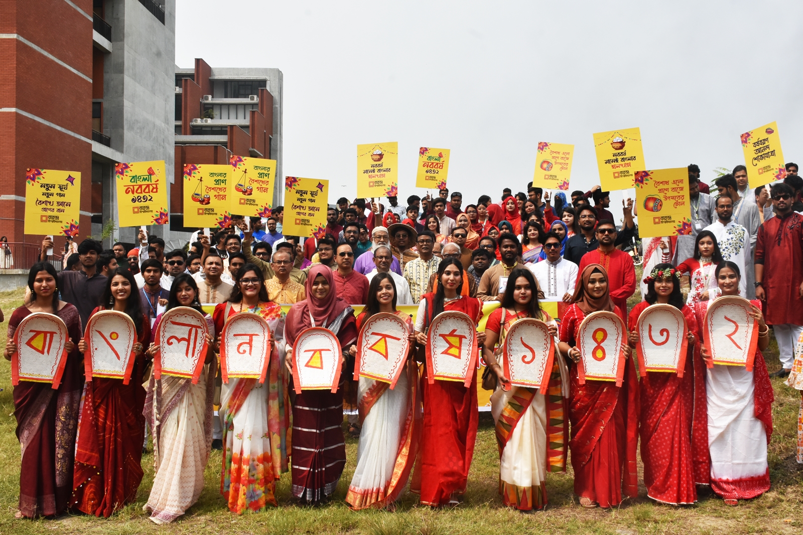 পহেলা বৈশাখের সকাল ছিলো অন্যন্য দিনের থেকে একটু ভিন্নরকম। সোমবার (১৪ এপ্রিল) সকাল ৯:৪৫ মিনিটে বিশ্ববিদ্যালয়ের শিক্ষক, শিক্ষার্থী এবং কর্মকর্তা-কর্মচারীদের পদচারণায় মুখর হয়ে ওঠে ক্যাম্পাস। বাহারি পোশাক আর হাতে হাতে শোভাযাত্রার ব্যানার ও ফেস্টুন-সব মিলিয়ে প্রাঙ্গণজুড়ে সৃষ্টি হয় এক বর্ণিল দৃশ্য। শোভাযাত্রাটি প্রাঙ্গণ থেকে শুরু হয়ে গোলচত্বর প্রদক্ষিণ করে শেষ হয় বিশ্ববিদ্যালয়ের খেলার মাঠে। শোভাযাত্রার তাল-লয় আর লোকজ বাদ্যের সুর যেন ঘোষণা করছিল-“এসো হে বৈশাখ, এসো এসো!”