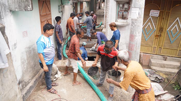 রাজশাহী সিটি কর্পোরেশনের উপ-প্রধান পরিচ্ছন্ন কর্মকর্তা সেলিম রেজা রঞ্জু জানান, রাসিক প্রশাসকের নির্দেশে ১১নং ওয়ার্ডে হরিজন পল্লী এলাকার ড্রেনের কাদামাটি অপসারণ কাজ শনিবার থেকে শুরু হয়েছে। এ কাজে ২২জন শ্রমিক নিয়োজিত রয়েছেন। আশা করা যায় কয়েকদিনের মধ্যে এই ড্রেনটির কাদামাটি অপসারণ কাজটি সম্পন্ন হবে।